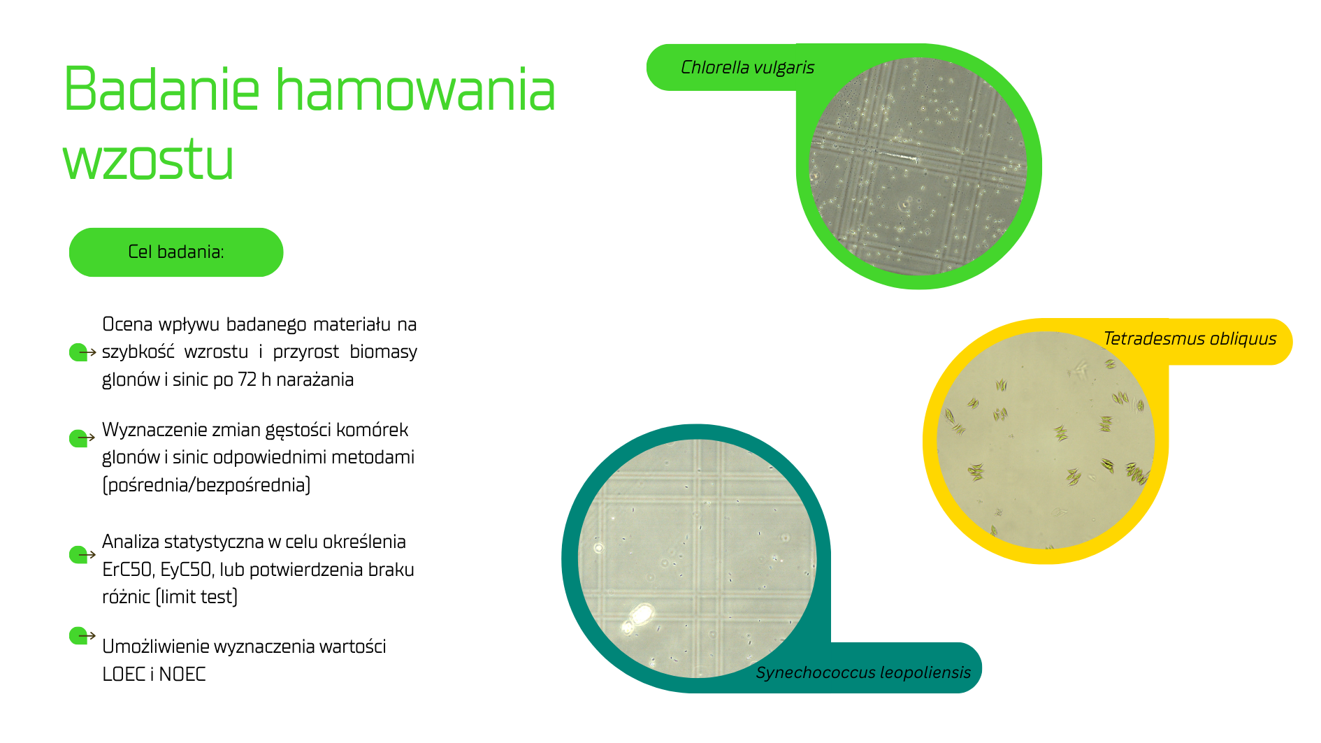 Celem badania jest określenie wpływu materiału badanego na szybkość wzrostu i przyrost biomasy glonów i sinic po 72 h narażania. Szybkość wzrostu i przyrost biomasy są wyznaczane na podstawie gęstości komórek glonów i sinic, która jest określana dla każdego powtórzenia metodą pośrednią dla glonów Tetradesmus obliquus i Chlorella vulgaris oraz bezpośrednią dla sinic Synechococcus leopoliensis.